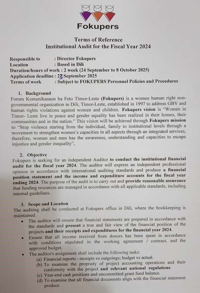 Fokupers hakarak fó hatene ba públiku katak, Fokupers agora dadaun loke vaga ba públiku ho Pozisaun Auditoria Institusionál ba Tinan Fiskál 2024/ Institutional Audit for…