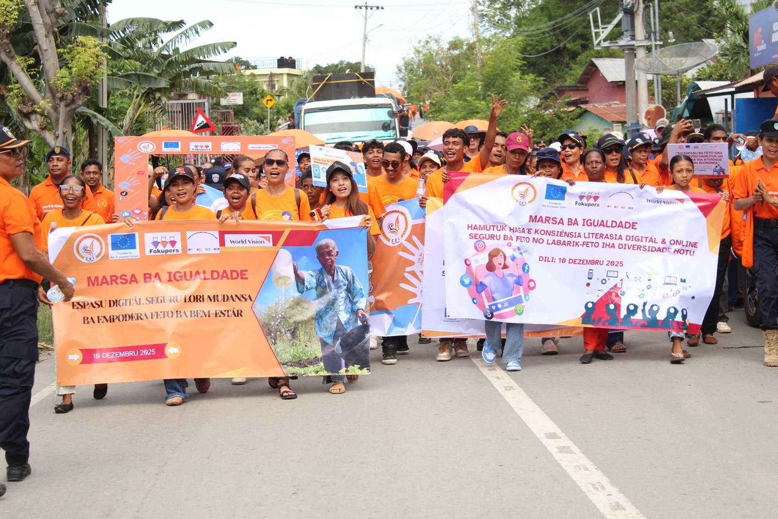 Organiza Marsa ba Igualdade ne’e, Fokupers servisu hamutuk ho Governu liuhusi Sekretaria Estadu ba Igualdade (SEI), hetan apoiu fundus husi Uniaun Europeia.