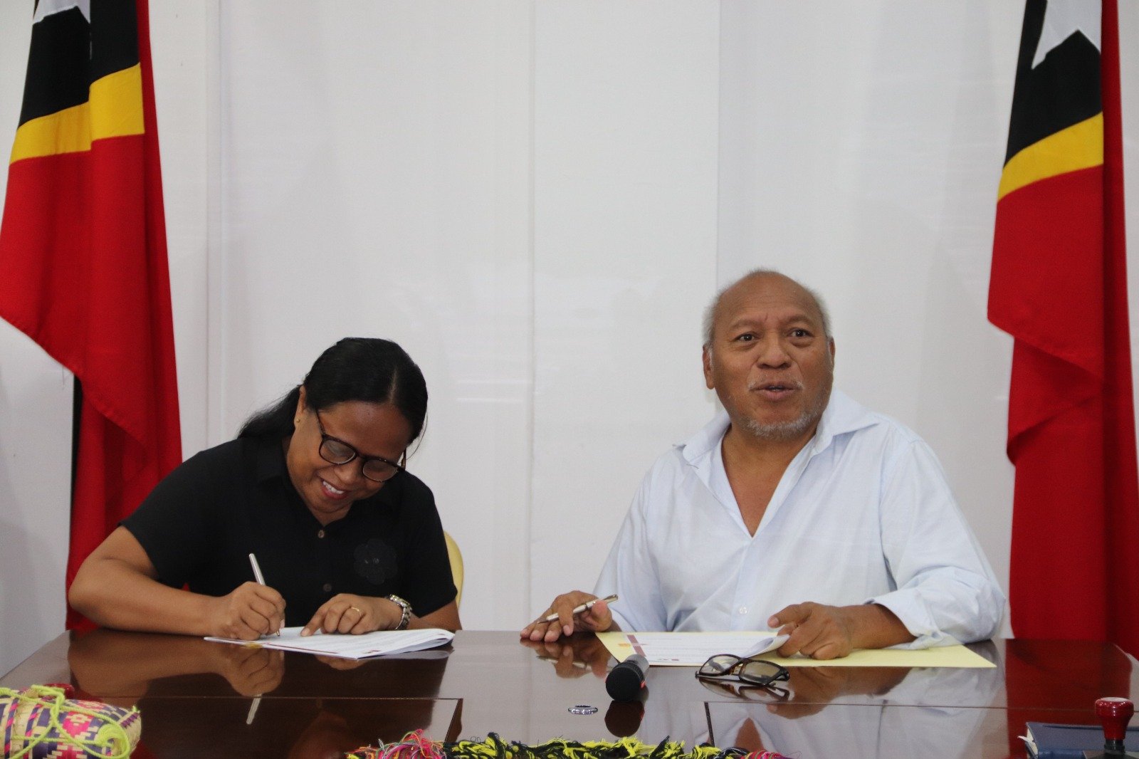 Diretora Ezekutiva Fokupers, Sra. Domingas Afonso Amaral, asina akordu ho GASC, Foto: Media Ofisial GASC. Data:23/04/2026.